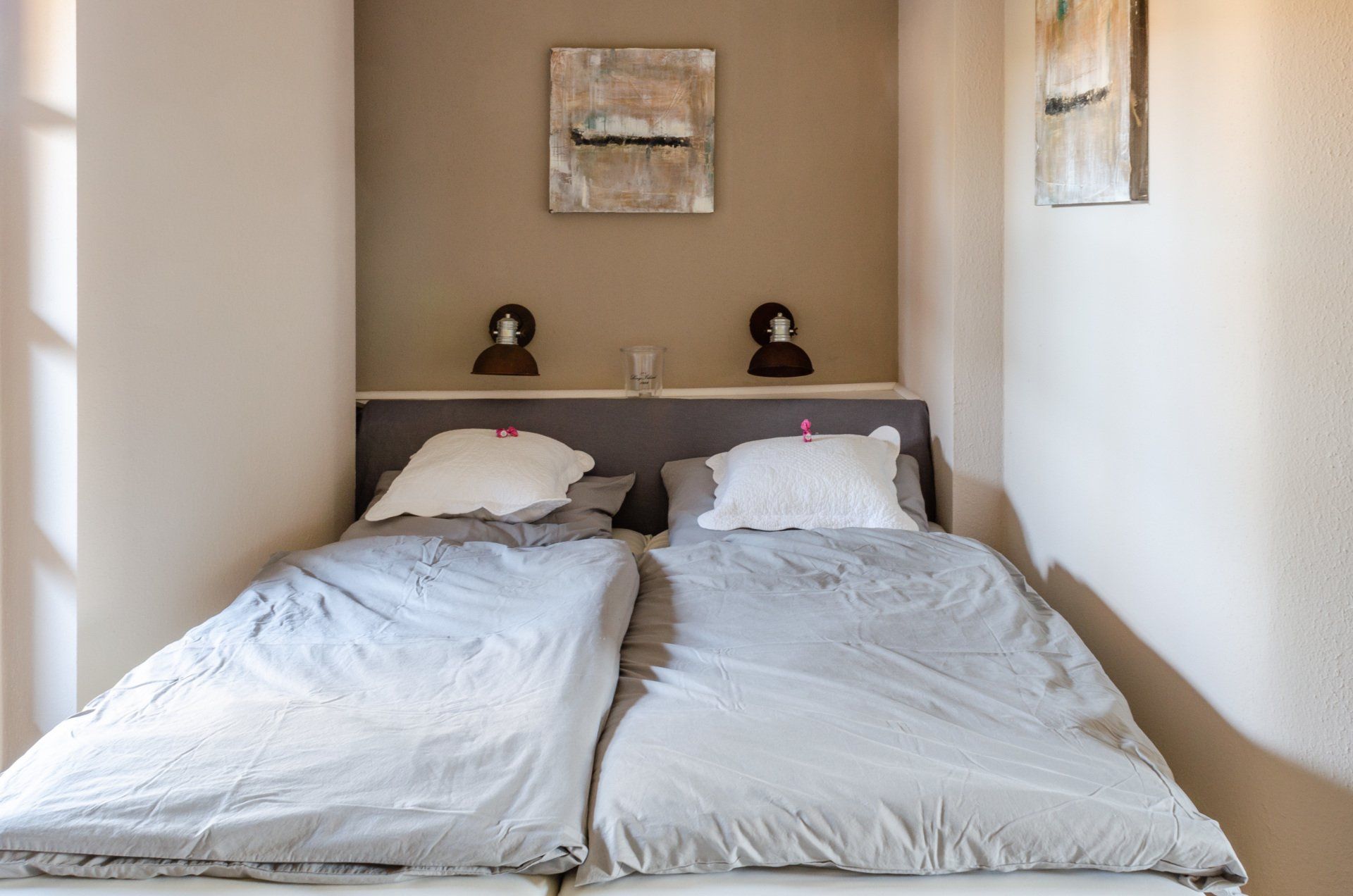 Die Wohnung ist lichtdurchflutet mit ruhigem und idyllischen Blick in die Dünen und den gepflegten Garten. Bei dieser Wohnung haben wir auf viele warme Töne gesetzt, die durch ihre dekorativen Elemente, sowie selbstgemalten Bildern an den Wänden ein gemütliches Flair bietet.
