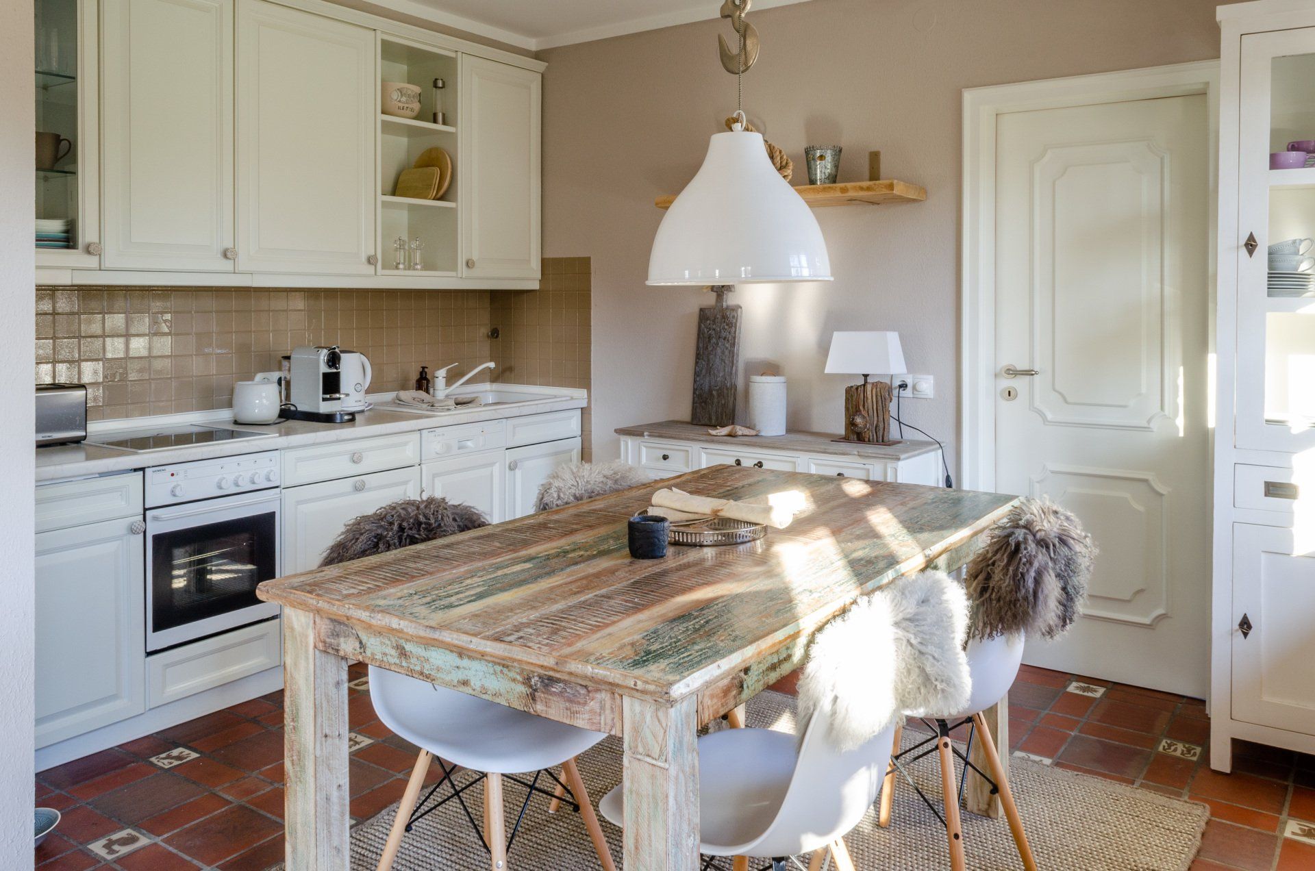 Offene Küche und Wohn-/ Essbereich. Die Küche hat einen schlichten altfriesischen Stil des Hauses bewahrt, um sie herum wurde der nordische Wohnstil kombiniert. Ein Vintage-Esstisch lädt ein für wundervolle gesellige Abende in eurem Urlaub. Wir setzen auf Liebe zum Detail mit ausgesuchten Wohnaccessiores, damit ihr euch auch wirklich Zuhause fühlt und euren Urlaub genießen könnt.