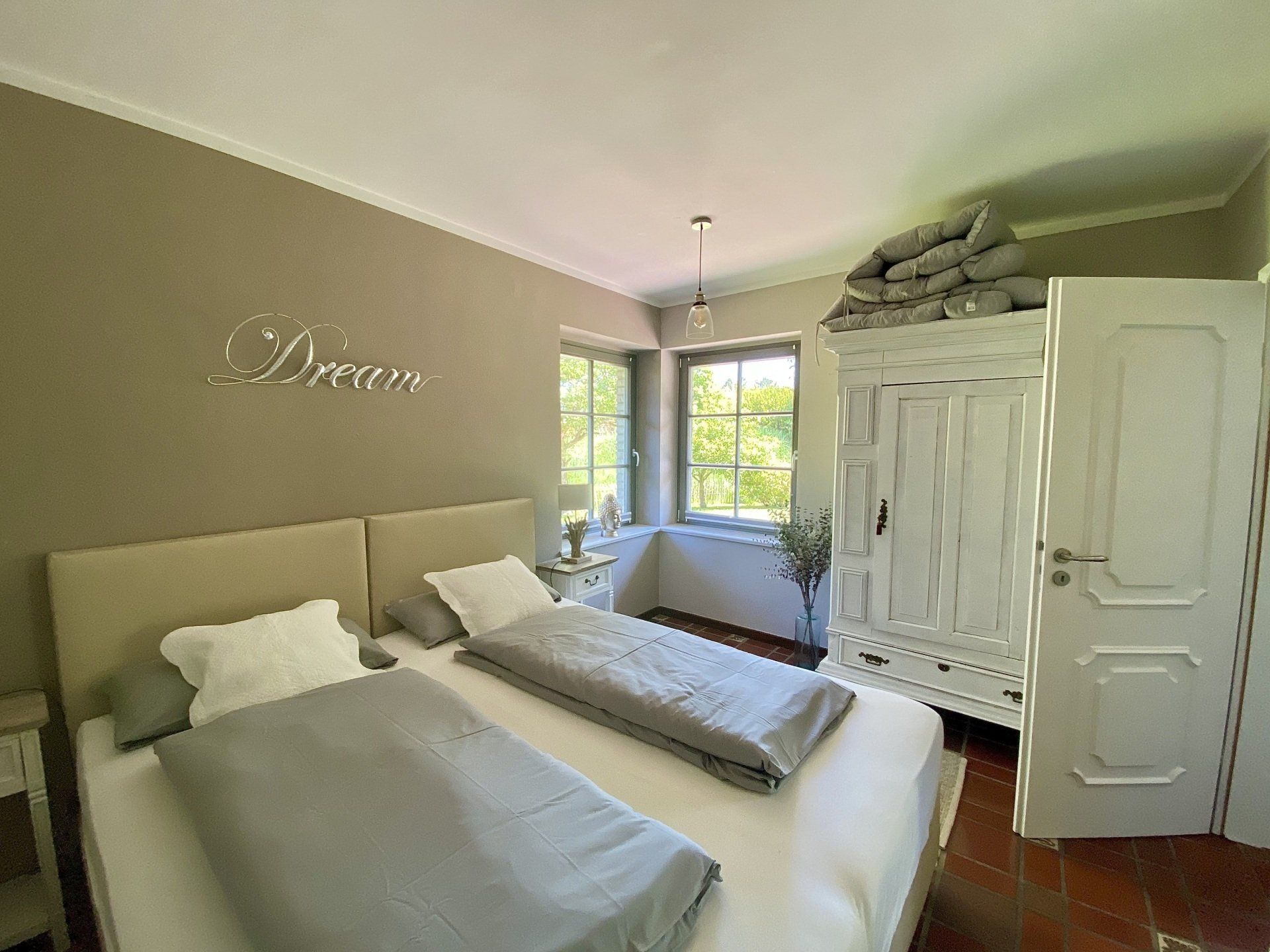 Das Gästezimmer ist ebenfalls ausgestattet mit einem Doppelbett für 2 Personen mit direktem Zugang zum ruhigen Garten mit dem dort stehenden Strandkorb. Für Stauraum gibt es dort einen großen Schrank für euer Gepäck.